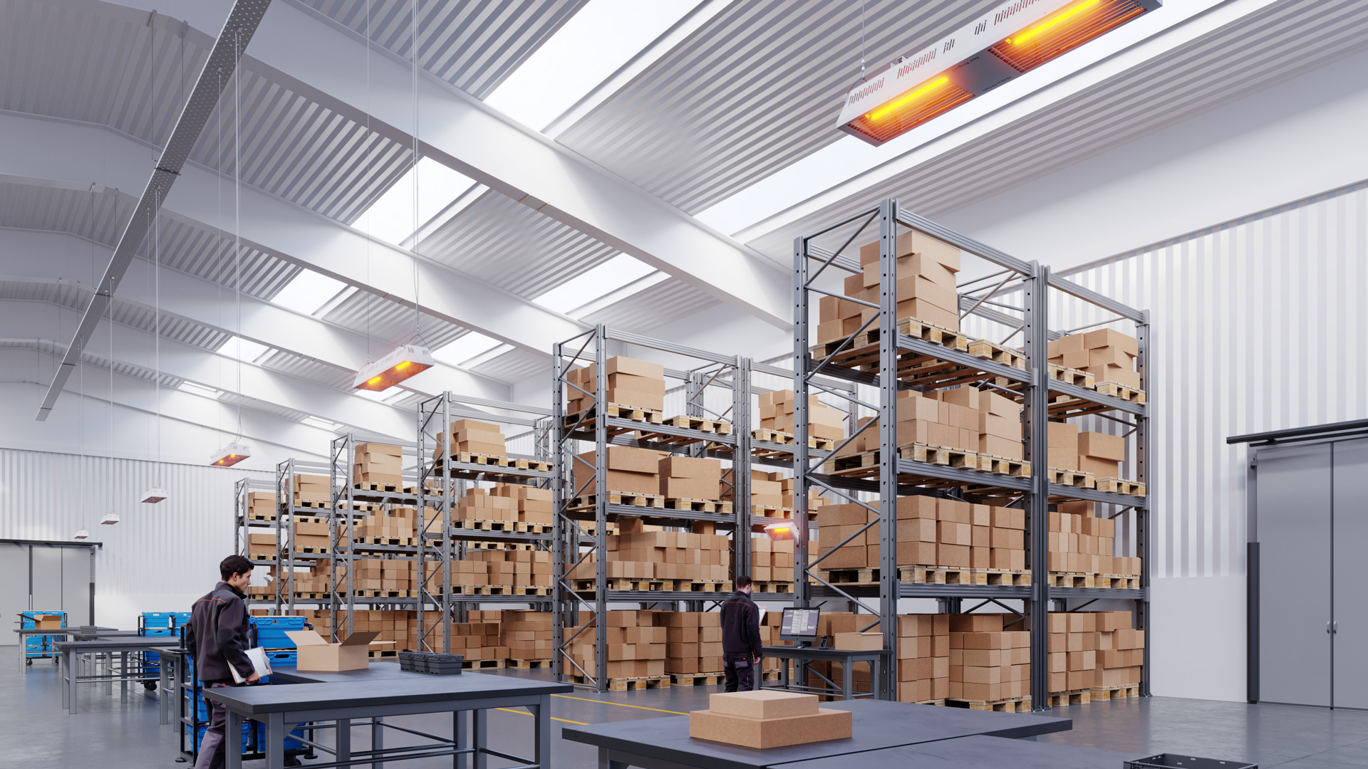 Infrarot-Heizstrahler sind in der Lage, bestimmte Bereiche der Halle zu beheizen und den Wärmeverlust zu minimieren. Dank der Infrarottechnologie, die Personen und Gegenstände direkt und unmittelbar erwärmen kann, ist es möglich, eine Lagerhalle nur bei Bedarf sehr lokal , sehr effizient und ohne Verschwendung zu beheizen .
